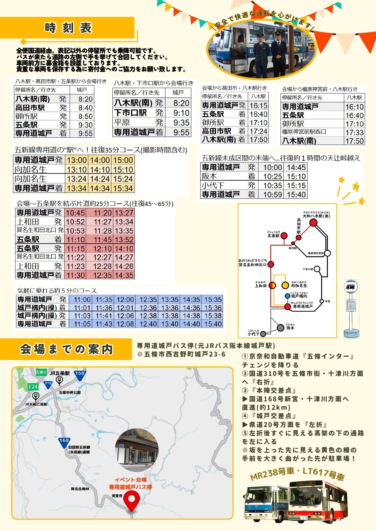 ・昼間の送迎シャトルバスとして、城戸11:20発五条駅行と、五条駅12:10発城戸行を運行します。